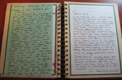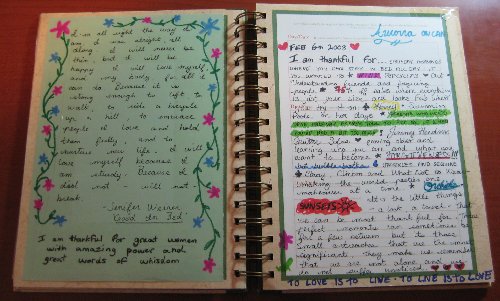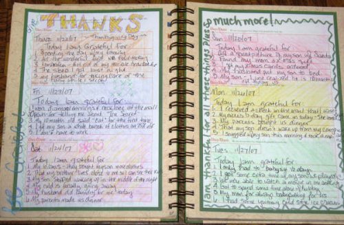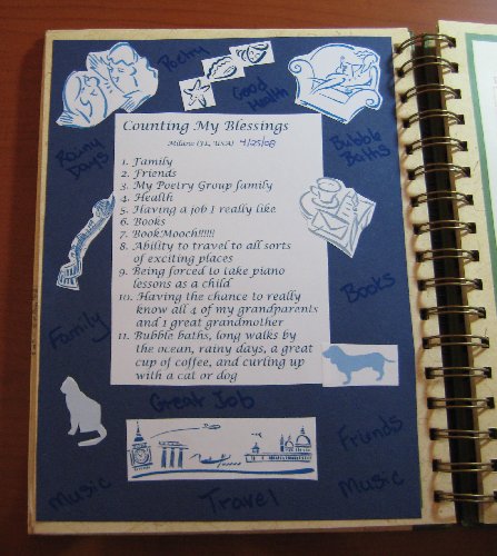 I found this unused gratitude journal at a “used” booksale and decided to share it with my fellow bookmoochers. It’s designed to be a daily journal where you list five things you are thankful for on each day. Each page has three days, so I’m not expecting any kind of strict adherence to this format. Use the whole page or multiple pages to write, draw, or collage what you are thankful for. When you are finished, please relist on bookmooch for the next person to add an entry. If you are the last person to mooch this book, please return it to me and I’ll ’smooch’ you a point to cover the postage.