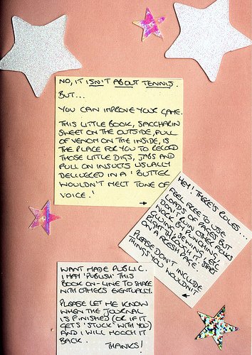 No, it isn’t about tennis. But you can improve your game. This little book, saccarhin sweet on the outside, full of venom on the inside, is the place for you to record those little digs, jabs and full on insults usually delivered in a ‘butter wouldn’t melt’ tone of voice.