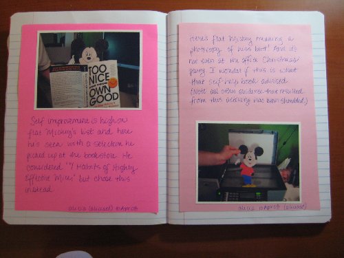 This pass along journal will come with a cut out of Mickey Mouse that I drew. Once you receive the journal your task will be to take pictures of flat Mickey in various places, doing various things while he is on vacation at your house. Include the pictures in the journal and write about your adventures together. You can even have ‘him’ send me a postcard while he is away, this is not required though. Please keep the journal no longer than 2 weeks and please don’t destroy anybody else’s work. Contact me when full, BM ID: mspeegle Have fun with flat Mickey! 🙂