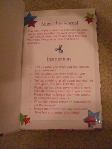 This is a journal started on 6/21/08. Hopefully you can help me and my husband out by giving us some advice on being married. Anyone can write in this- we appreciate all views. Tell us what you wish you had known, what you ignored from others but wish you hadn’t. We want to hear the good, the bad, and the ugly.