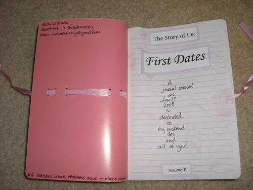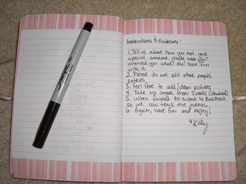 This is the first journal in a trilogy I am making. Journal about the first time you met your special someone. Where were you? What were you wearing? Can you remember the day? Tell us the fun (or maybe not so fun) details. This book is for any couple married, engaged, young, old, etc. Please care for this journal as if it were your own. Pass it along the way after you have finished and try to finish within the 2 week period (standard journaling).