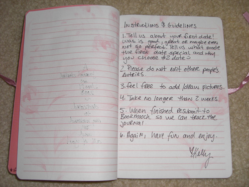This is the second journal in a trilogy I am making. Journal about the first date you and your special someone had. Where were you? What were you wearing? Can you remember the day? Tell us the fun (or maybe not so fun) details. This book is for any couple married, engaged, young, old, etc. Please care for this journal as if it were your own. Pass it along the way after you have finished and try to finish within the 2 week period (standard journaling).