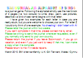 This is a journal game. Following the alphabet strictly use the next block of 4 pages (i.e. two colours) to write, draw, paint, use pictures, describe – a bird whose name begins with that letter. I have given two examples for each letter in case you are really stuck, but you are welcome to choose your own. For letter Z I could only think of one example. No cheating! I didn’t start with A! Please relist the journal within two weeks. If you can’t complete in that time, please contact me by email. Please be willing to send the journal wherever requested, even if you normally only send to your own country. Please return the journal if you leave Bookmooch, if you go on vacation, and even if you just want to keep it! Ask me, I can make a copy when it is complete. Please return to me if it needs repairs.