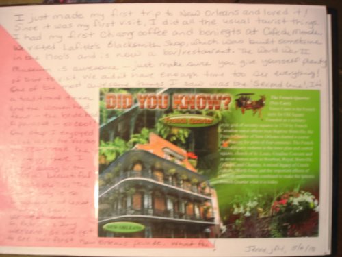 I always pick up a few postcards when I travel. The pictures are usually better than I can take and it’s a cheap, easy way to get a souvenir. Take a page, put a travel postcard on it and tell us about your trip. Make us want to visit! Use any medium you’d like – just don’t alter the entries of others. The journal isn’t large, so limit your entry to one page, please! When the journal is full, please return to jfit, Jenny Stafford.