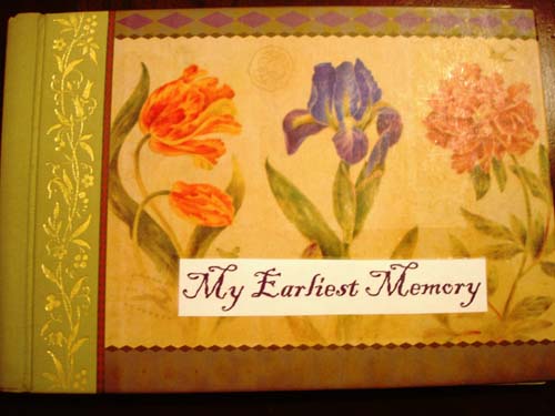 I’ve often thought that I need to write down things for my children about my childhood. I’m very interested in the early lives of my parents and grandparents, but no one has really passed down any stories or history. I’d love to hear about YOUR earliest memory – we all have one! You can use any medium you’d like – just make sure not to alter anyone else’s entry. When the journal is full, please let me know and I’ll mooch it! Jenny Stafford, jfit.