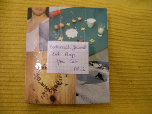 This journal is meant to travel together with Volume 1 of “Eat Poop You Cat” (http://bookmooch.com/m/detail/BM1299919284298196868). One of them starts with a picture, the other with a sentence, and I wanted each moocher to be able to add both words an illustrations.